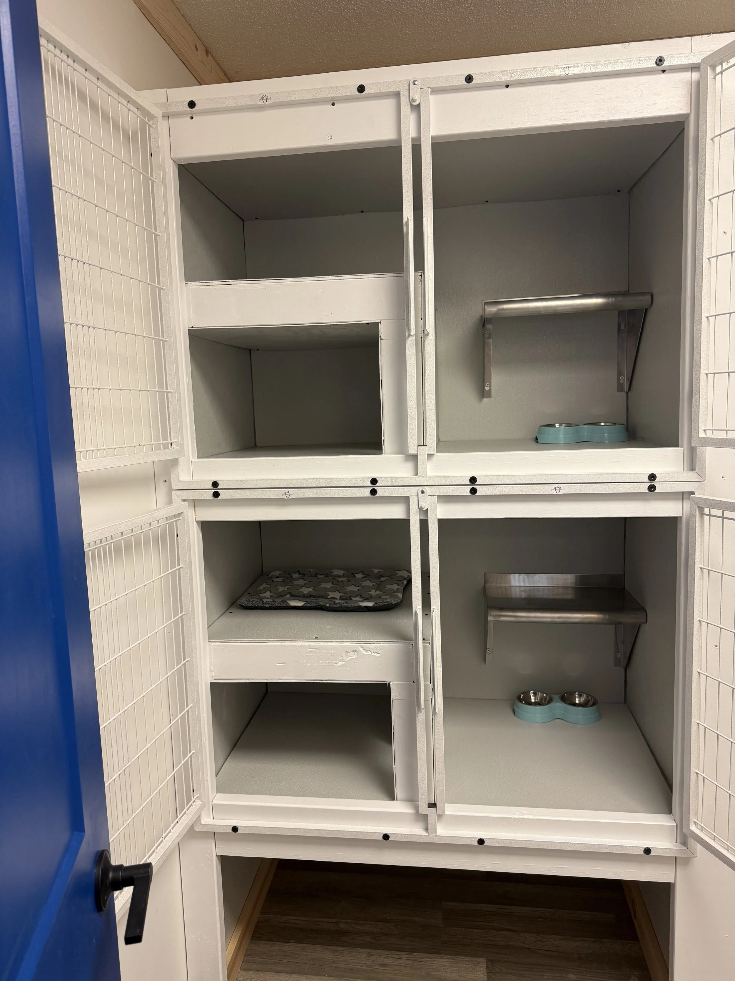 At Blue Ruff Pet Lodge, we know cats deserve more than just a kennel. Our cat boarding suites are designed for comfort and calm — with soft bedding, climbing shelves, and plenty of space to stretch. Each guest enjoys a quiet, separate area away from dogs to minimize stress, plus daily care and playtime tailored to their personality. Whether your cat loves lap cuddles or prefers independent lounging, our team makes sure they feel right at home. (See Boarding tabs for additional information and pricing)
